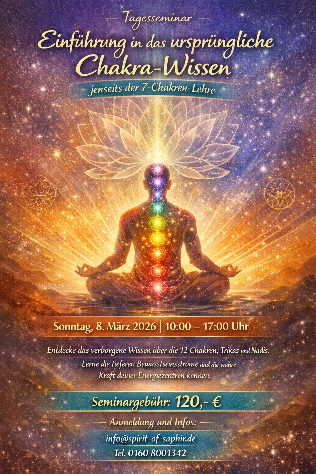 Erlebe mit mir eine tiefgehende Reise in die Erforschung und Wahrnehmung deines Chakrasystems. Neben dem Darstellen des sehr komplexen, hochesoterischen ChakraWissens wird es in diesem Seminar auch Raum für ein direktes Wahrnehmen und Erforschen dieser feinen Bewusstseinsströme geben.